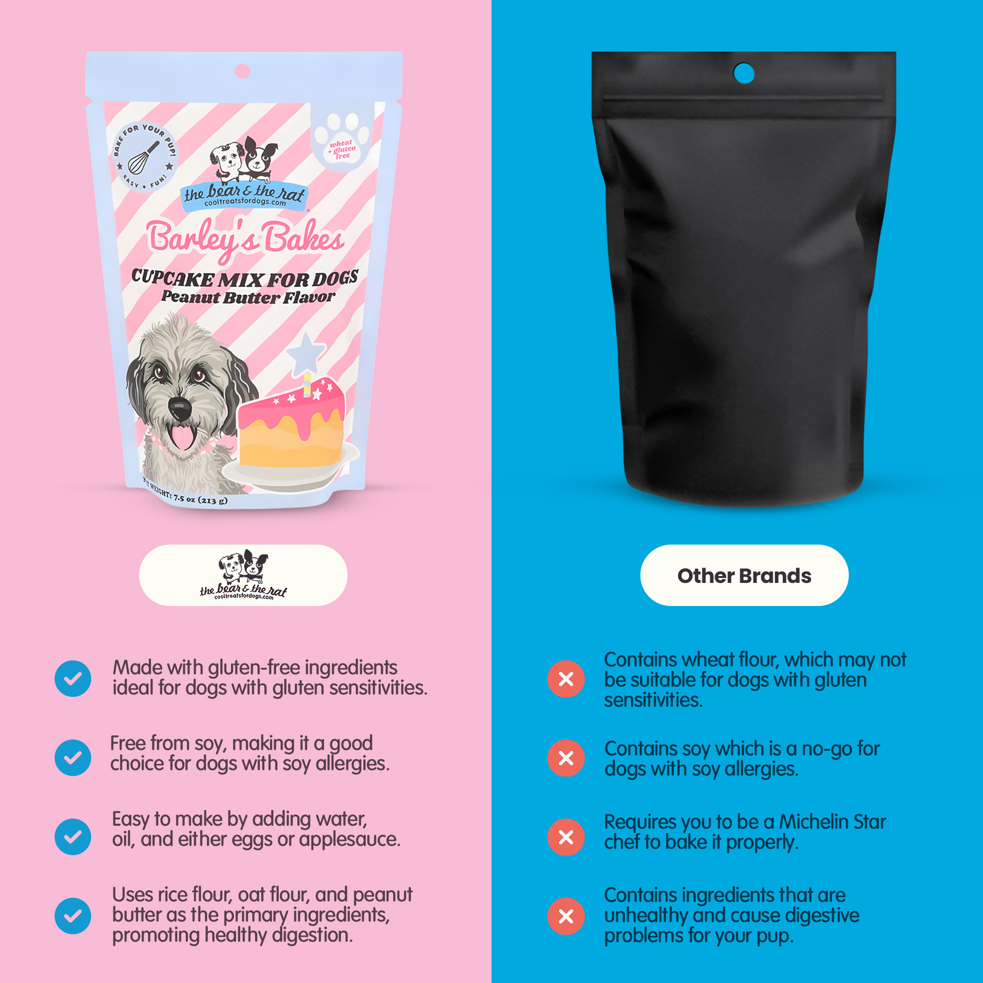 Wholesome, Dog-Friendly Ingredients Made in USA – Each baking mix is wheat-free, gluten-free, and soy-free, featuring real ingredients such as rice flour, oat flour, chicken bone broth, or peanut butter, ideal for health-conscious dog owners.